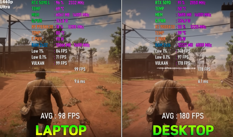 Here’s an example to show the FPS difference between a laptop and desktop RTX 5090. In Red Dead Redemption 2 at ultra settings and 1440p, a laptop averages around 98 FPS, while the desktop version nearly doubles that, reaching about 180 FPS.