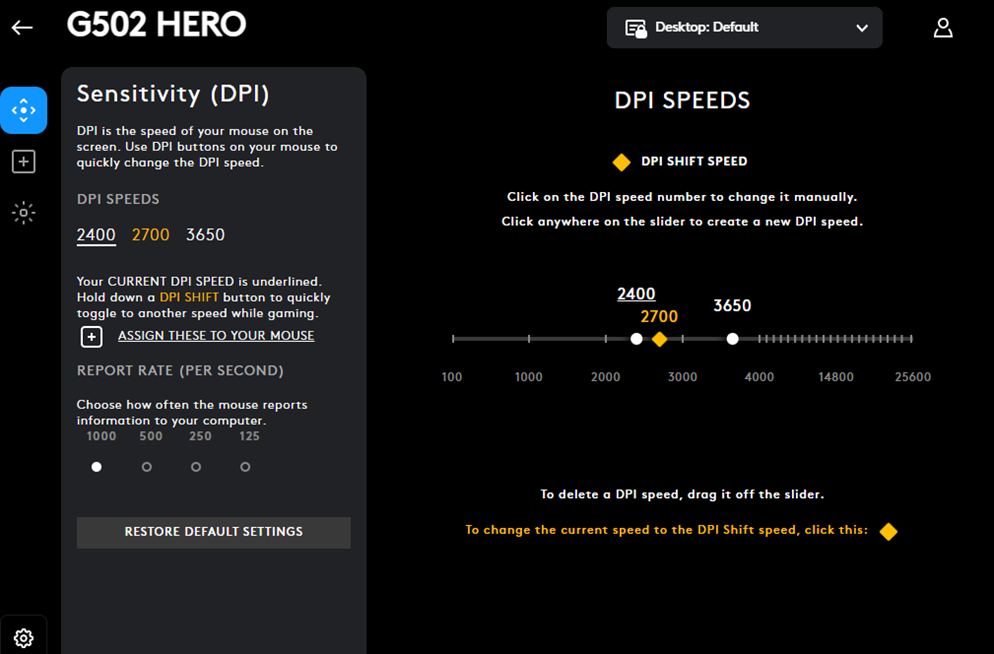 On average, I usually stick to a DPI range between 2400 and 3650. Using the software, you can set up different profiles and switch between them quickly with the buttons on the mouse.